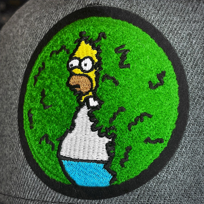 - Fancy 'Disappearing Homer' patch applied to front *with green chain stitch bush*.